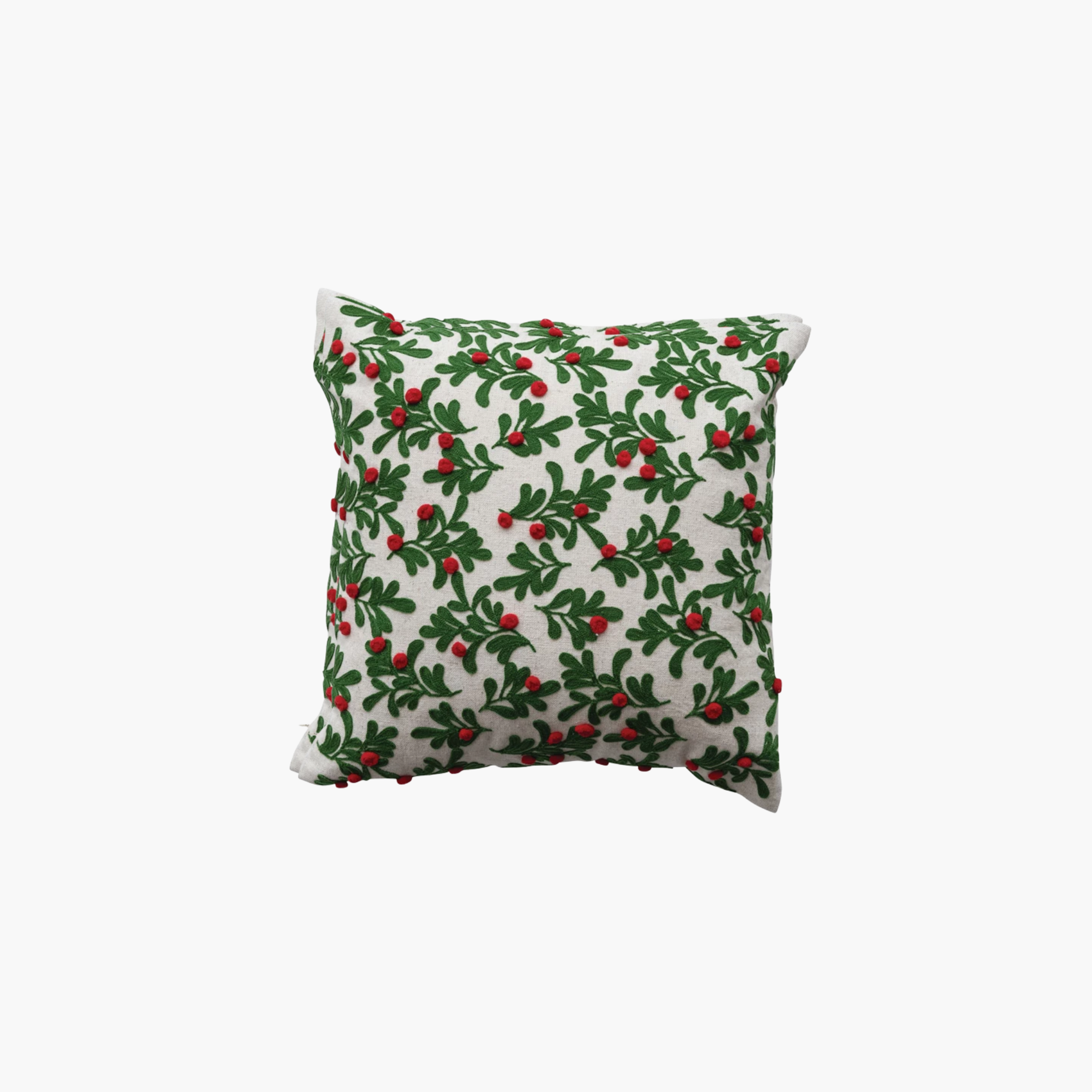 Deck the halls with this cheerful 16-inch square pillow featuring a festive embroidered mistletoe design in natural, green, and red tones. Crafted from a soft cotton and linen blend, it's topped with charming pom poms that add a playful touch to any room. Perfect for spreading holiday cheer on your sofa, bed, or favorite reading nook all season long.