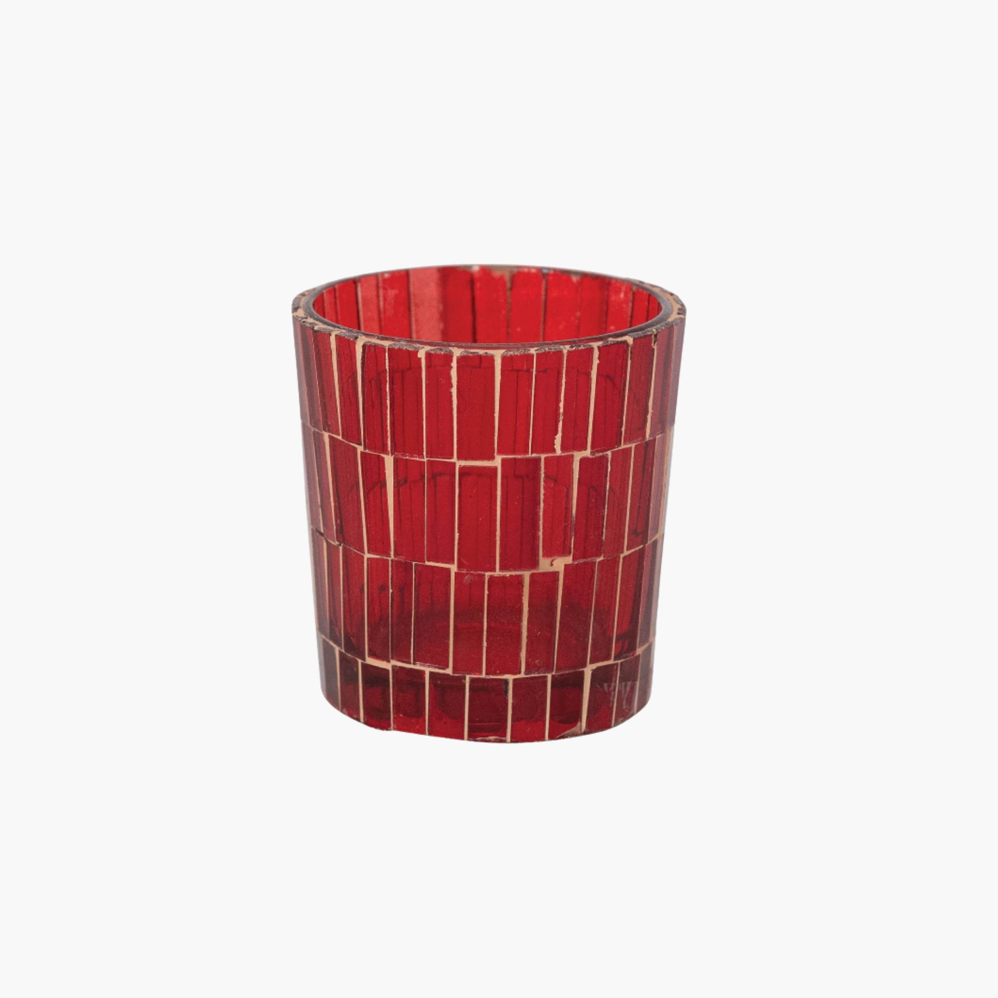 Light up your décor with this ruby-red glass mosaic tealight holder that's bursting with personality. Standing 2-3/4" tall with a matching round base, this compact beauty transforms any flame into a dazzling light show through its colorful mosaic pattern. Whether you're setting a romantic mood, adding festive flair, or simply brightening a corner, this versatile holder works magic on nightstands, mantels, and shelves alike. A playful way to bring warmth and sparkle to your home.
