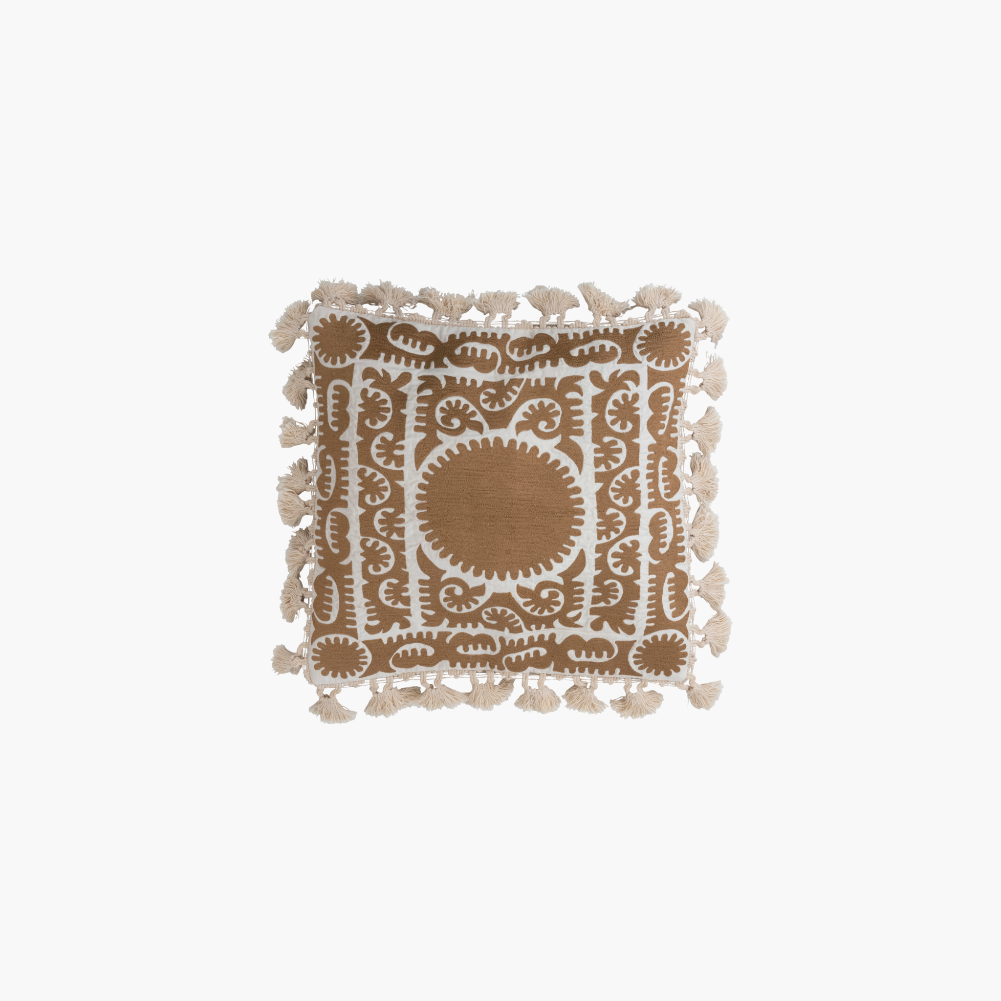 Bold, beautifully embroidered cotton pillow with playful tassels and a cream chambray back. Gold and cream colorway adds instant personality to any room. Removable cover with hidden-zip closure and polyester fill—machine or hand wash for easy care.