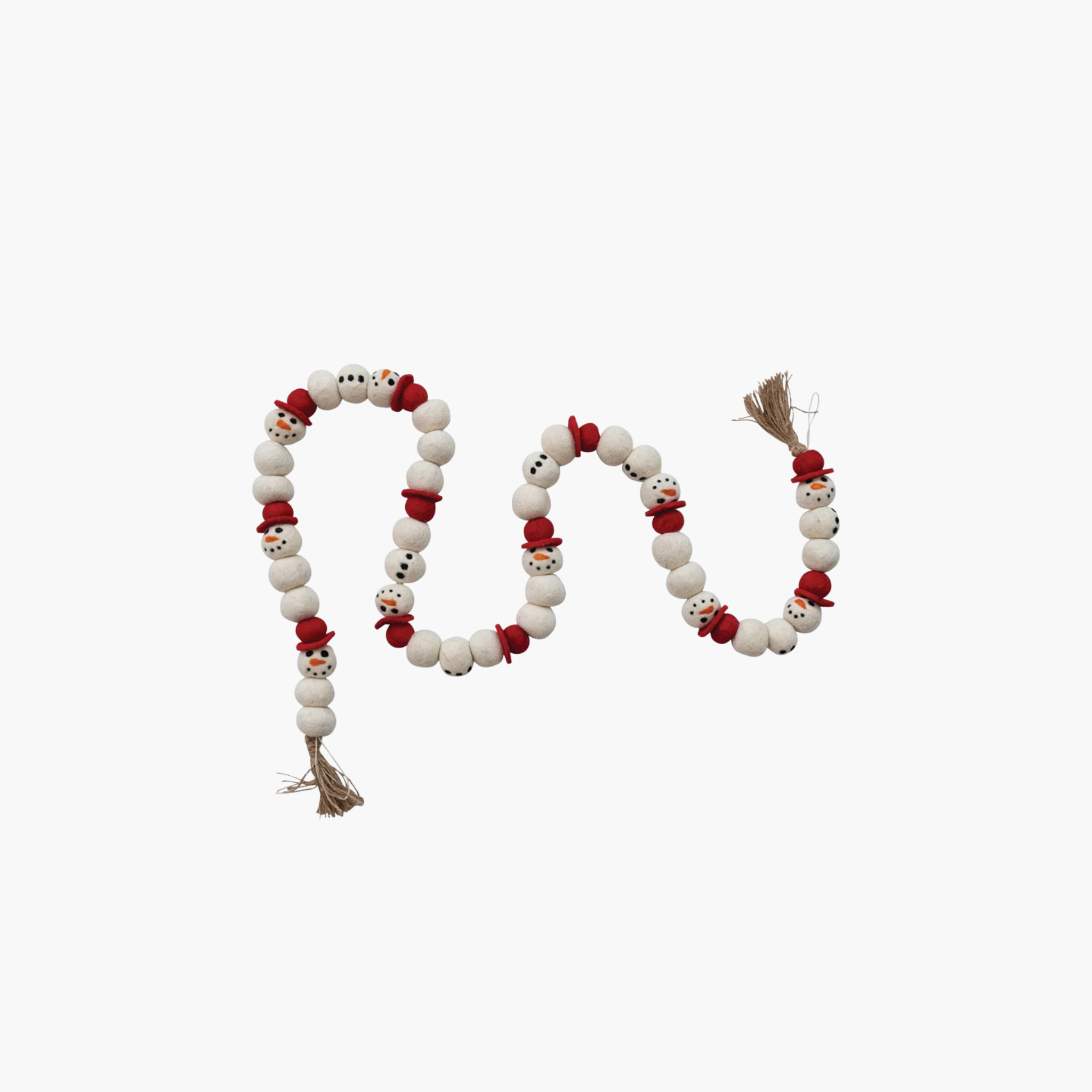 This 72" long and 1-1/2" high garland features charming handmade wool felt snowmen, accented with rustic jute tassels for a cozy, festive touch.