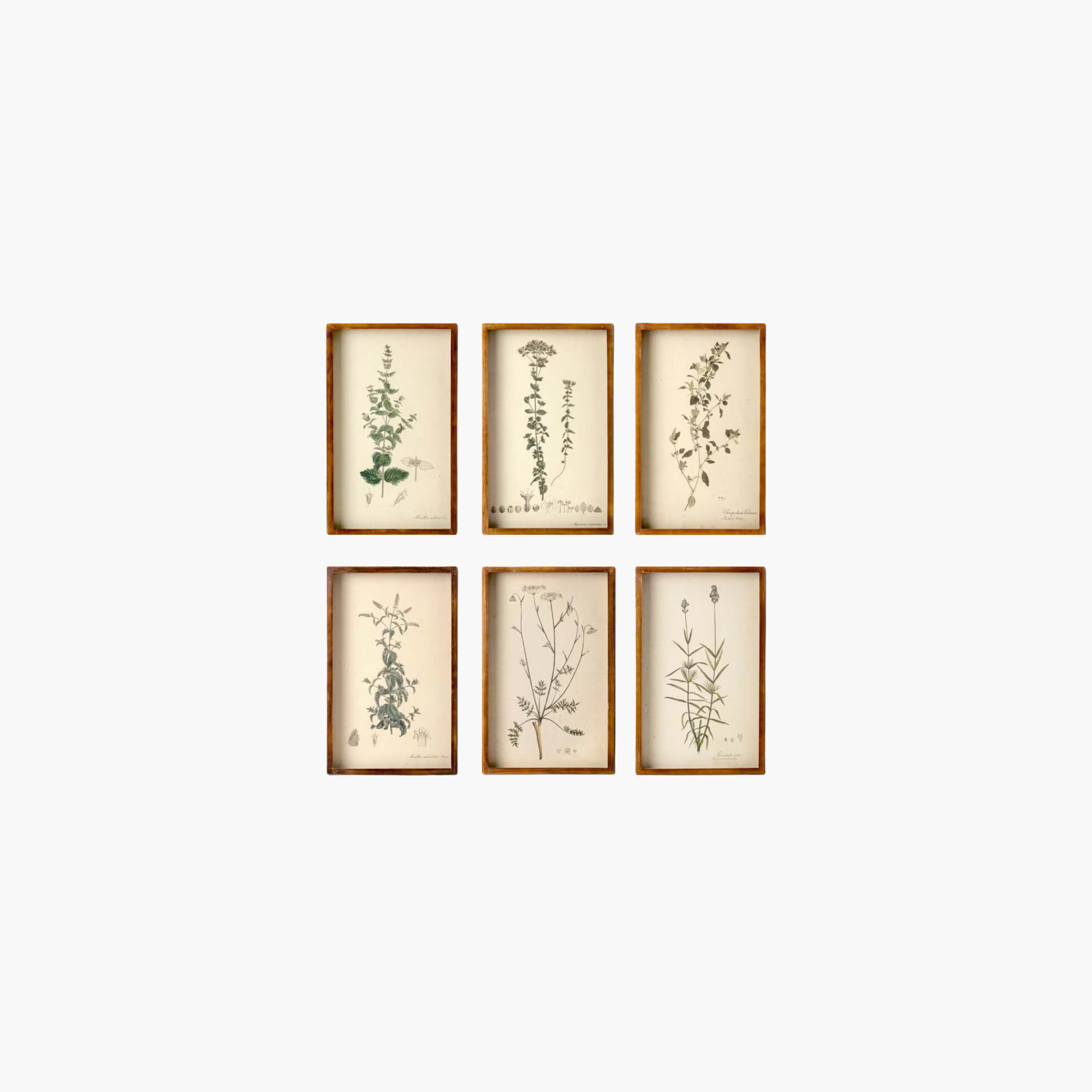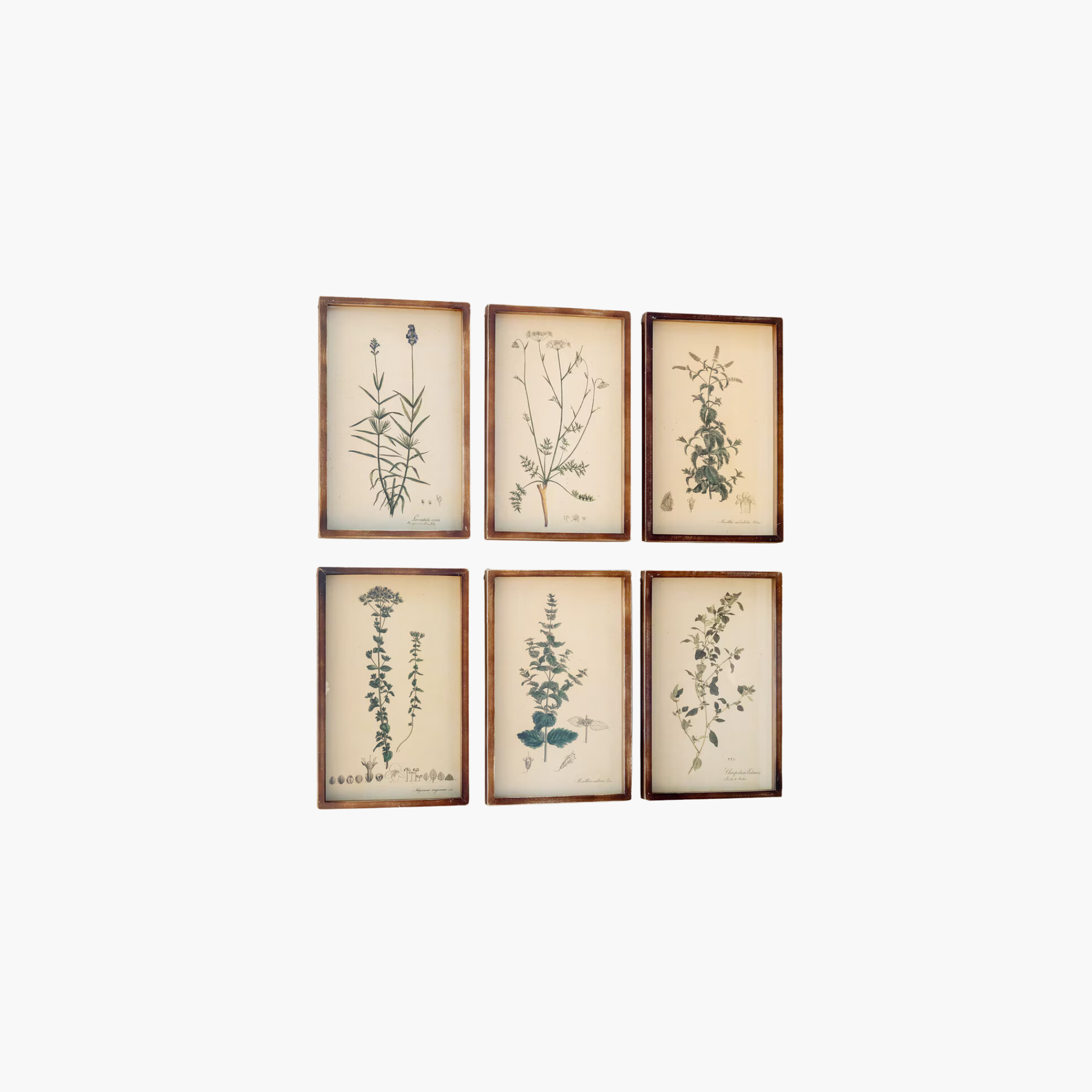 Embrace the beauty of nature with this collection of 6 vintage botanical prints, each encased in a shadowbox frame with glass. The prints showcase Lavender, Queen Anne's Lace, Sage, Marjoram, Salvia, and Oregano in all their glory. The aged aesthetic is complemented by a natural wood frame, adding a touch of charm to any space. Dimensions for each print are L11.75" x H18.75". Sold only as a set of 6.