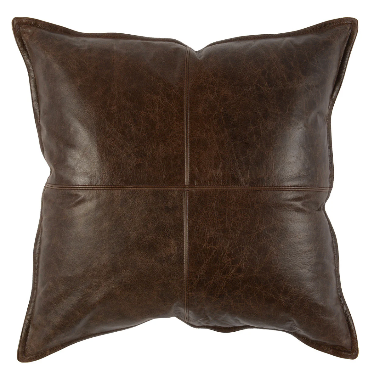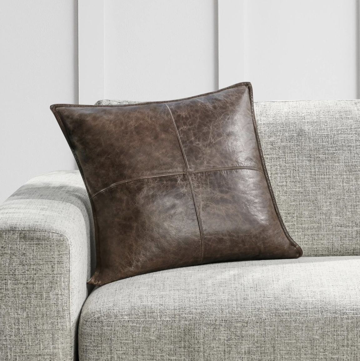 Genuine cocoa leather crafted with stitched detailing and filled with a premium feather blend for luxurious comfort. The distressed leather develops a soft patina while maintaining durability, making it a versatile accent for any room. Natural variations in color and texture enhance its distinctive character.