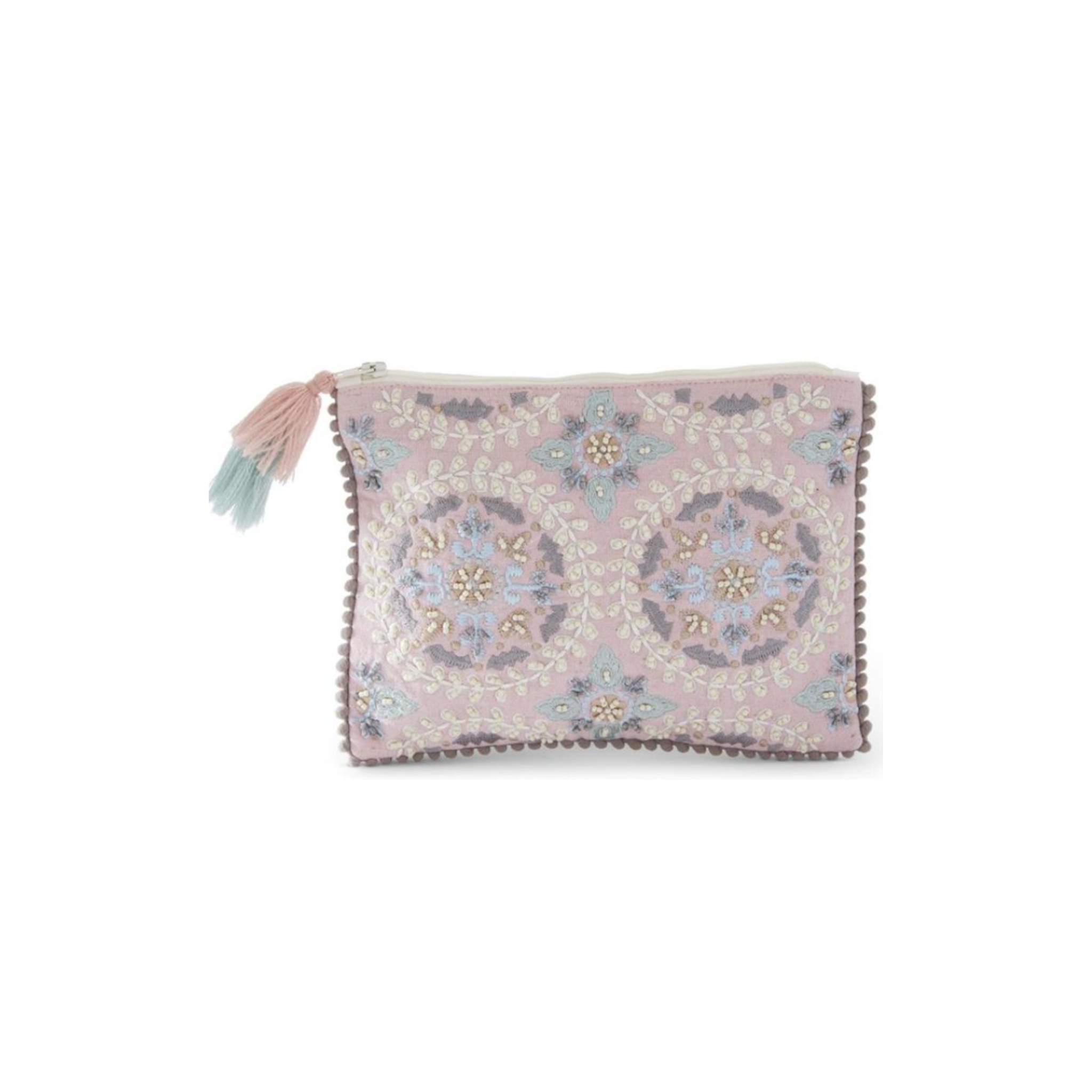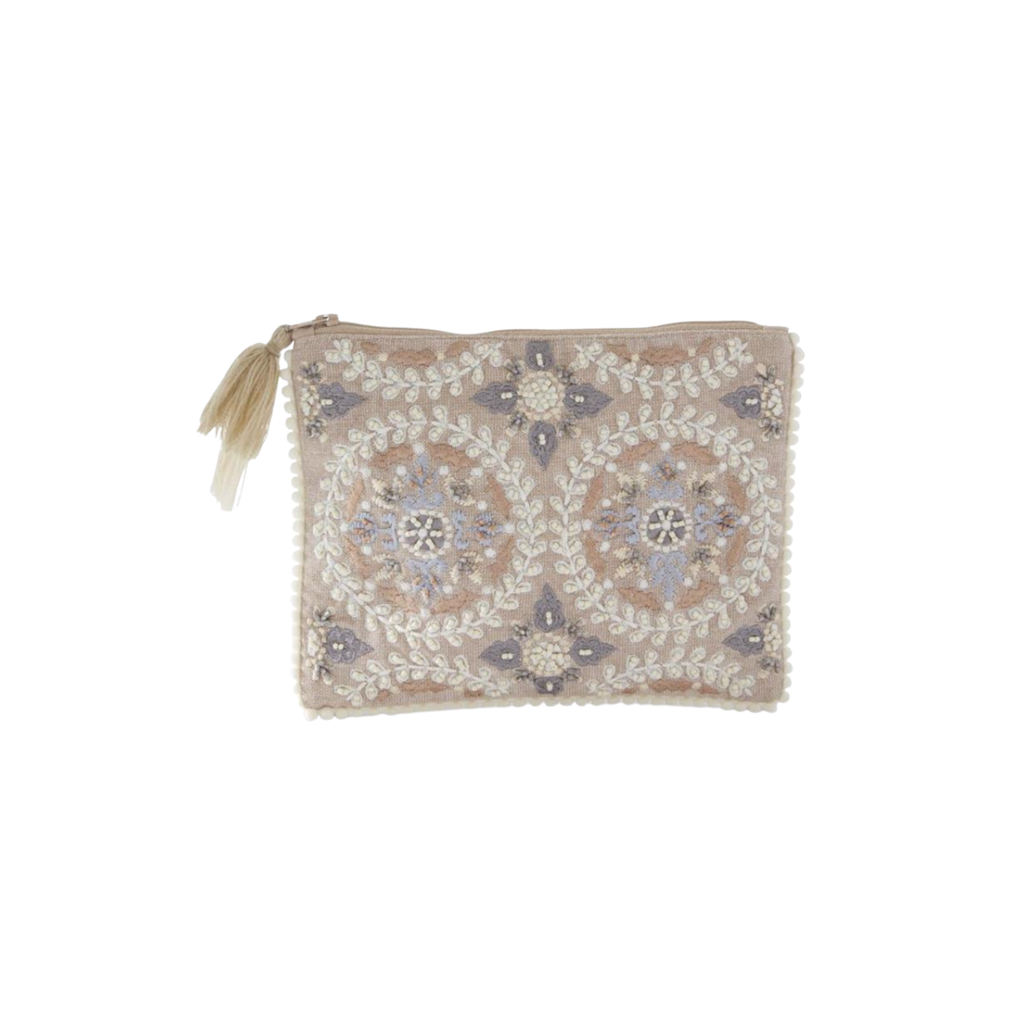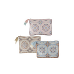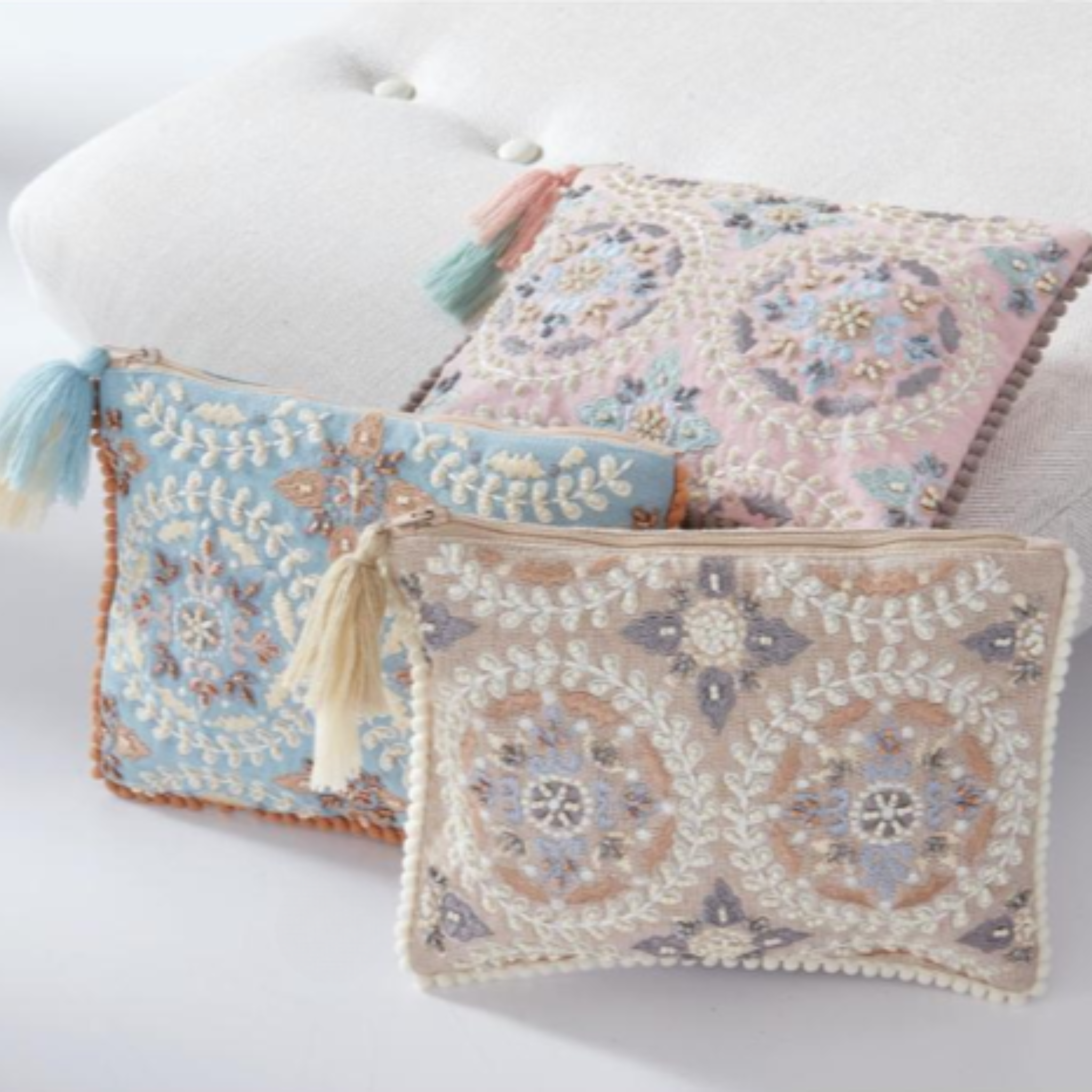 These Circle Embroidered Cosmetic Bags come in three fun shades: Pink, Blue, and Natural. Pick your favorite—each bag is sold on its own!