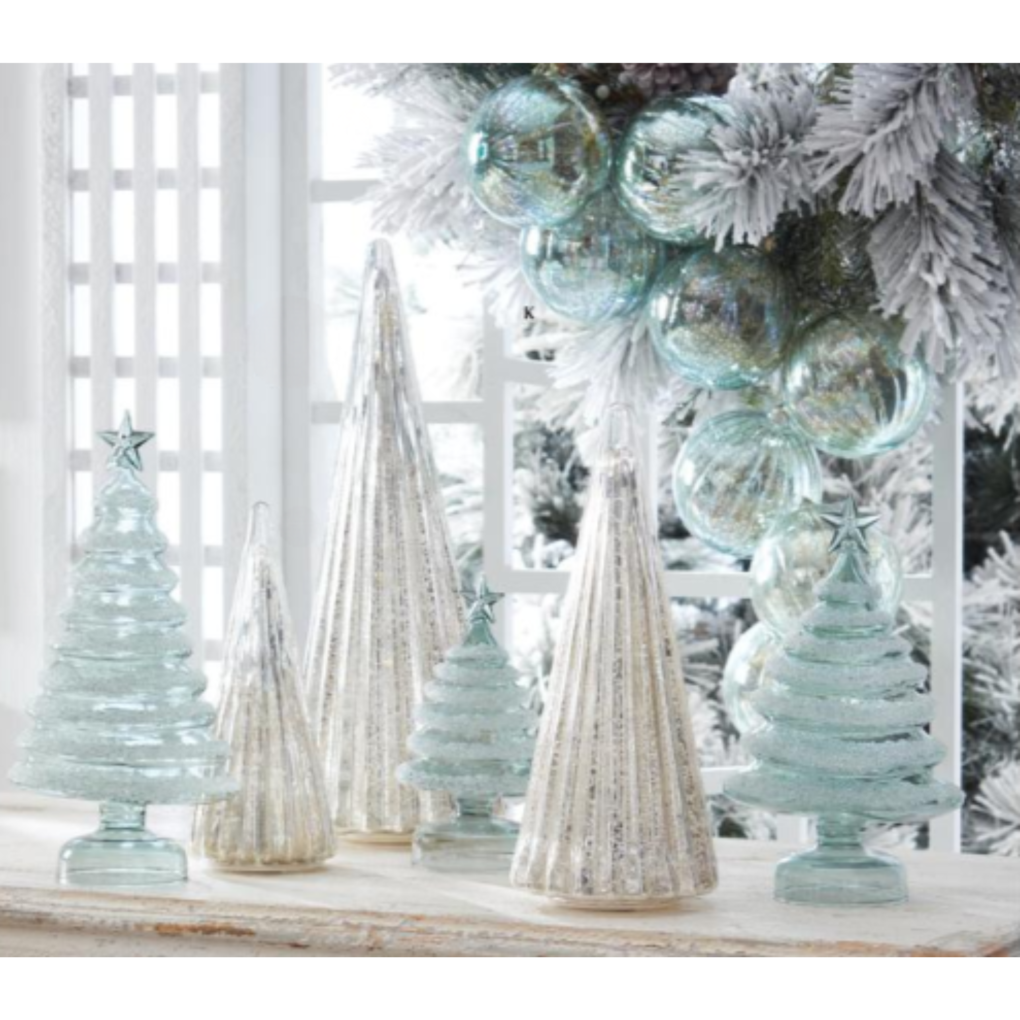 Sage Glass Iced Layers Christmas Trees add a soft, shimmery touch to your Christmas decor. Available in three sizes: Sm-8", Med-10.75", Lg-13". Each size sold separately.