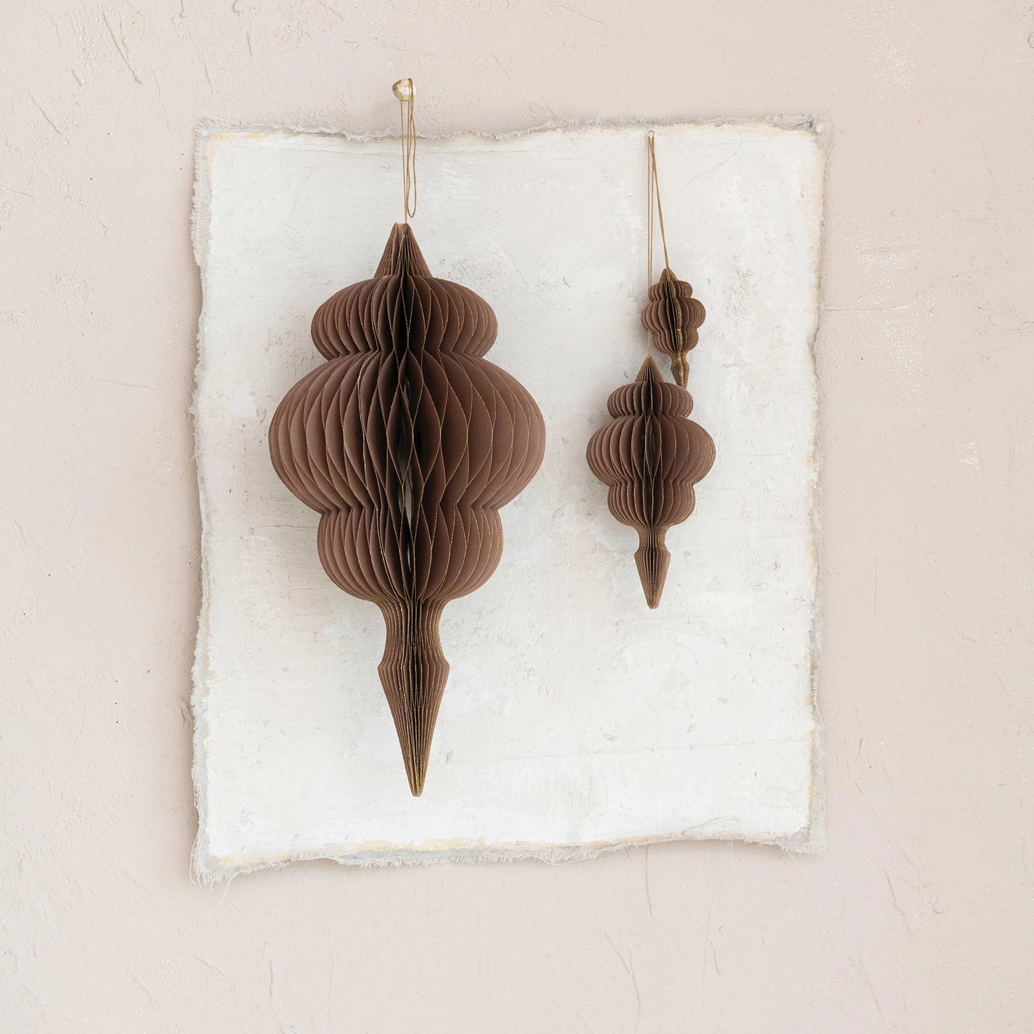 Create an elegant, textural look with these honeycomb finial ornaments. Made of folded paper and attached with a string, they add a sophisticated touch to any holiday decor. Their neutral color and size make them the perfect statement piece that can easily blend into any color scheme. This set of 3 finial-shaped ornaments will bring an exquisite, traditional element to your festive decorations. Perfect for creating a focal point on your Christmas tree or as part of a stylish holiday display.