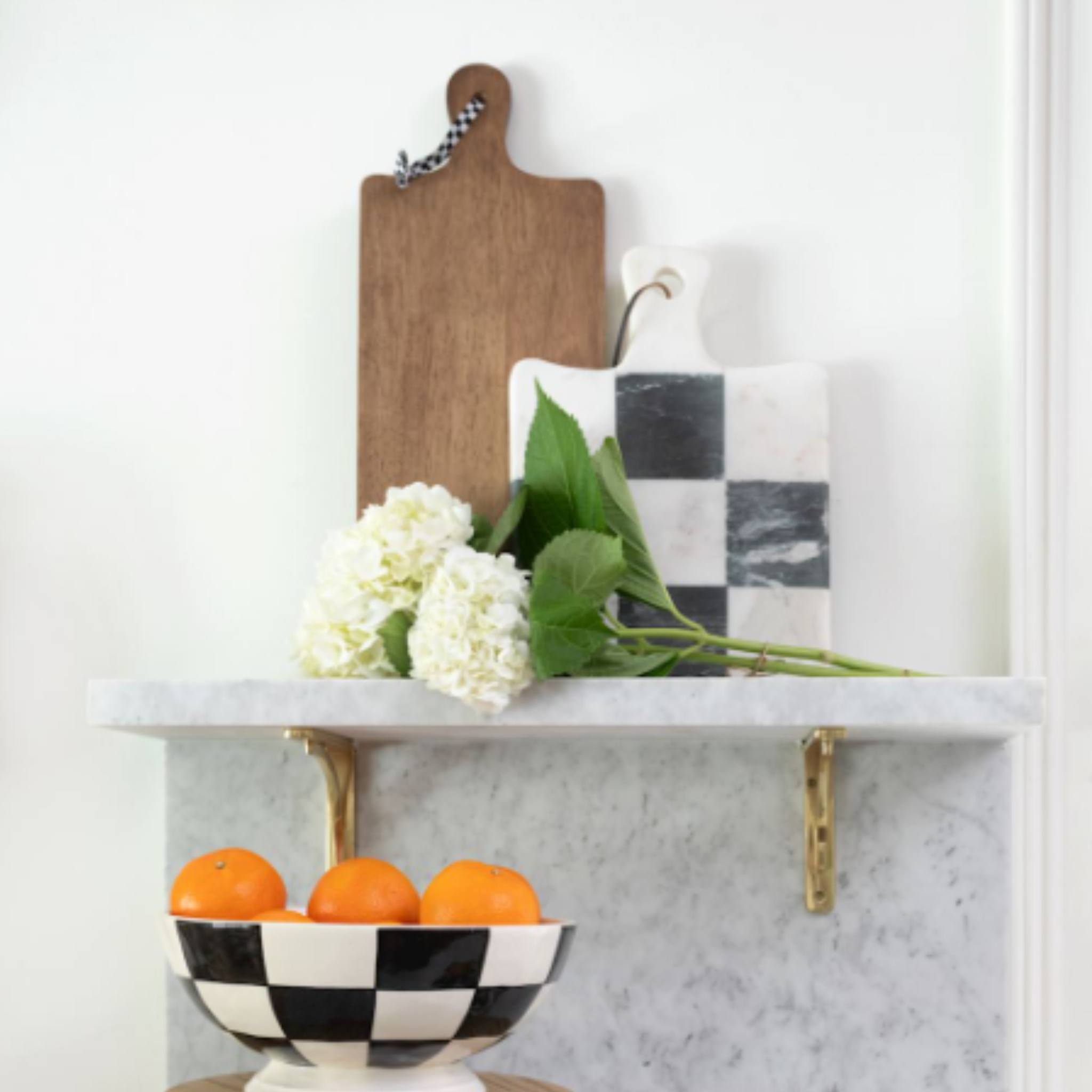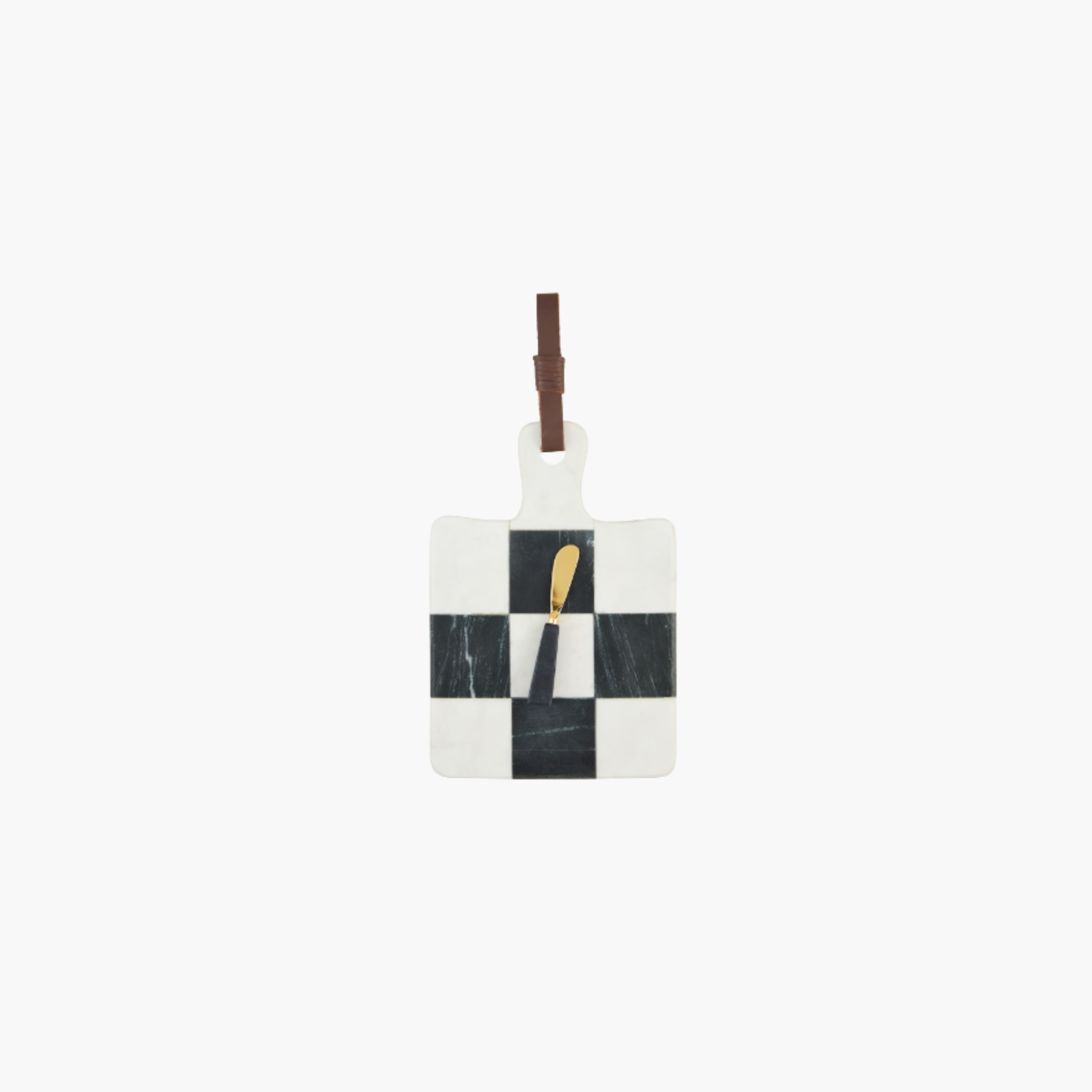 Add a pop of playfulness to your kitchen decor or party spread with this Marble Checkerboard Cheeseboard Set. Measuring 12" x 9", it comes complete with a leather handle for easy transport. The set includes a marble cheeseboard and a canape knife, perfect for hosting or simply displaying on a shelf!