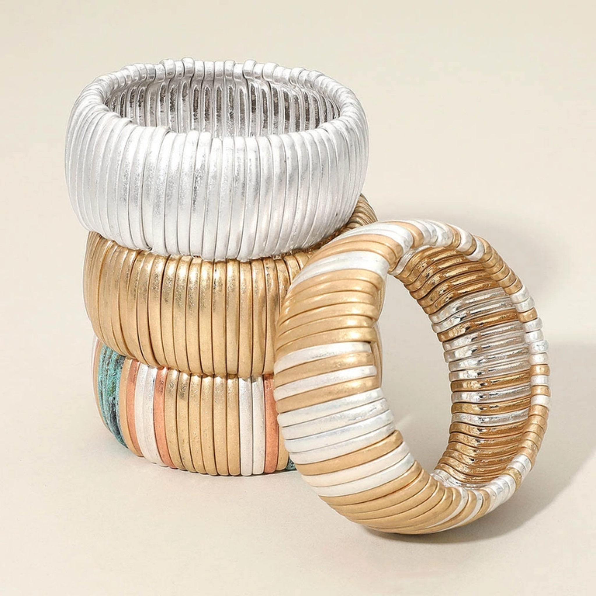 Add a cool edge to your accessories with this Metal Bar Stretch Bracelet. Choose from three finishes: Worn Gold, Worn Gold & Silver, or Worn Patina. Each color is sold individually, so pick your favorite or collect them all!