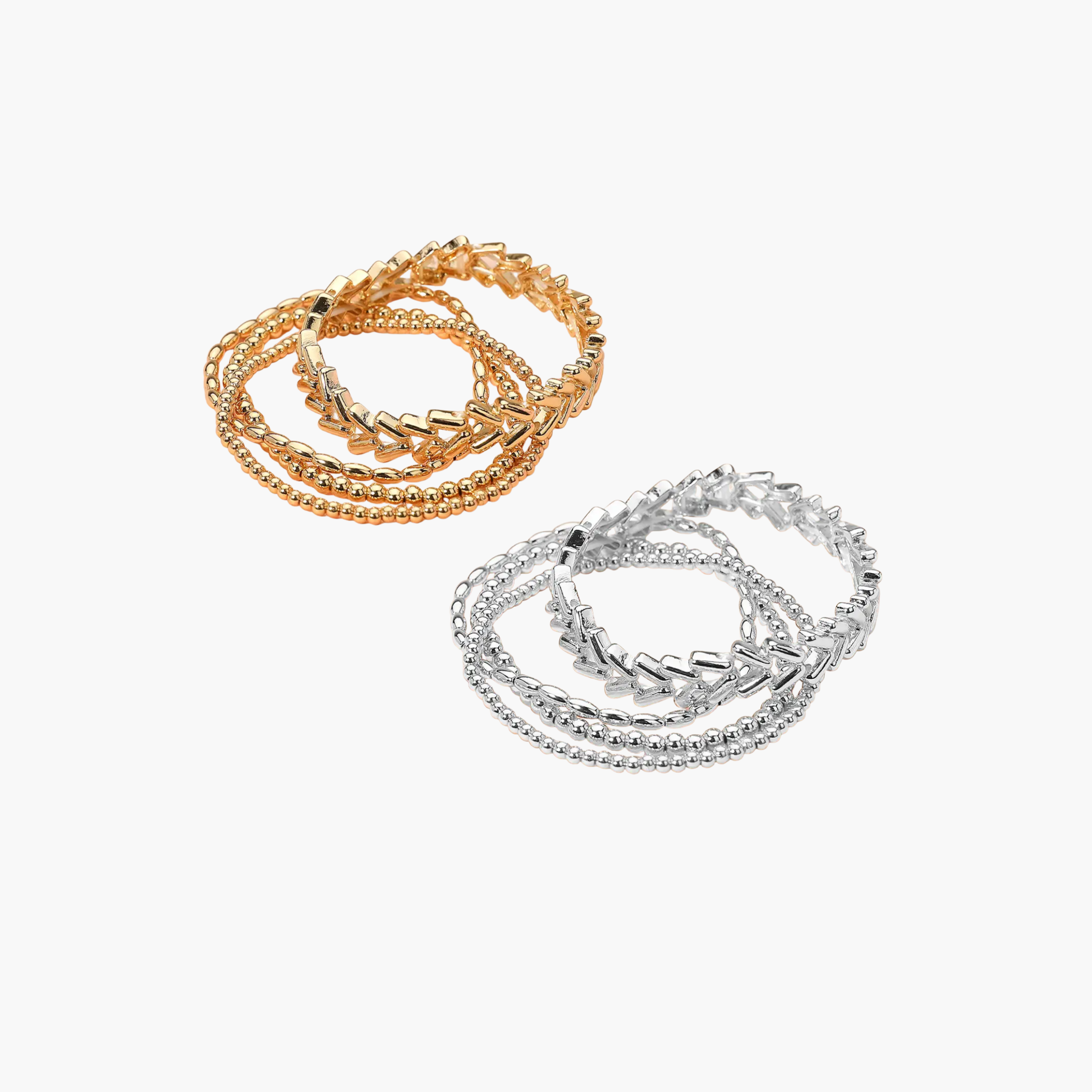 Stack your wrist with instant sparkle! This four-piece bracelet set combines delicate metal beads with stretchy comfort for effortless layering. Mix and match in your choice of radiant gold or sleek silver—or grab both shades to double your styling options. Perfect for creating that coveted multi-strand look without the fuss.