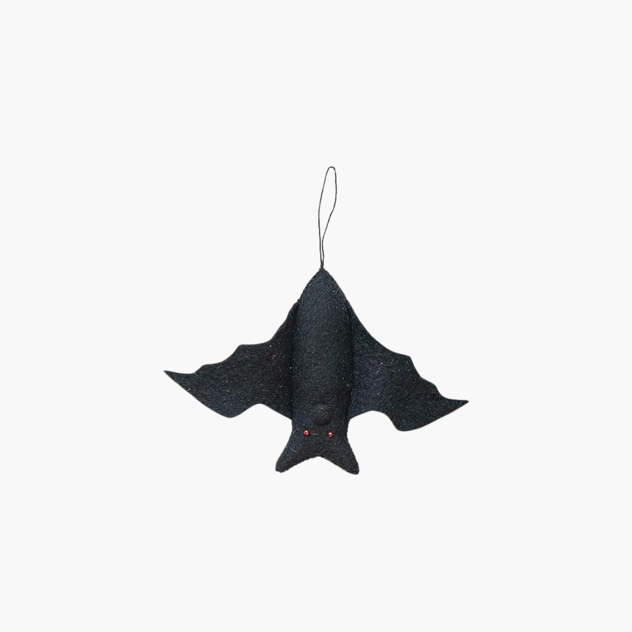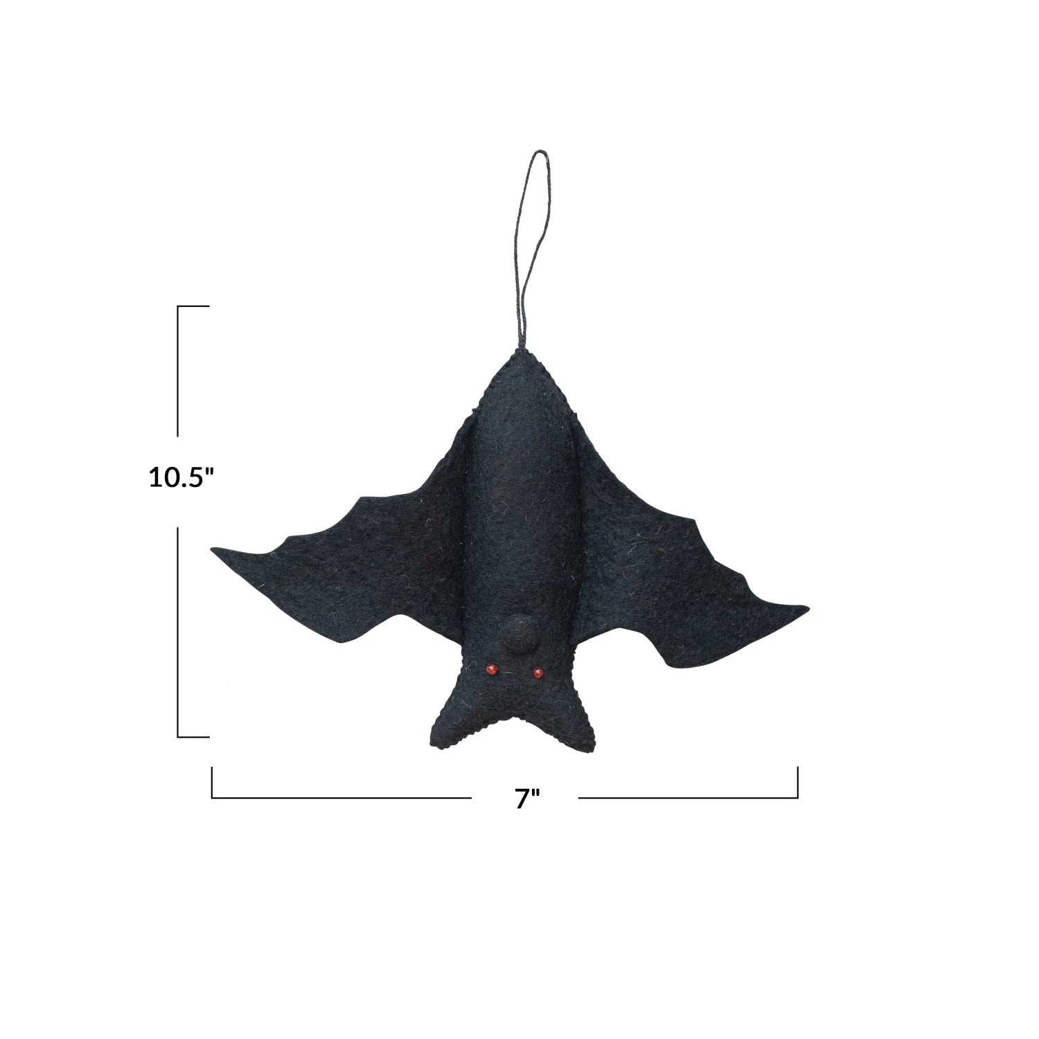Make your Halloween decor stand out with this luxurious handmade bat ornament. Crafted from soft wool felt, the ornament features a sleek black face with elegant pointed ears and piercing red eyes. Hang it with the included black string for a sophisticated touch to doors, windows, walls, or fireplaces. With its unique variations in shape, size, and color, this 10.5-inch long and 7-inch high piece is a must-have for any discerning Halloween enthusiast.