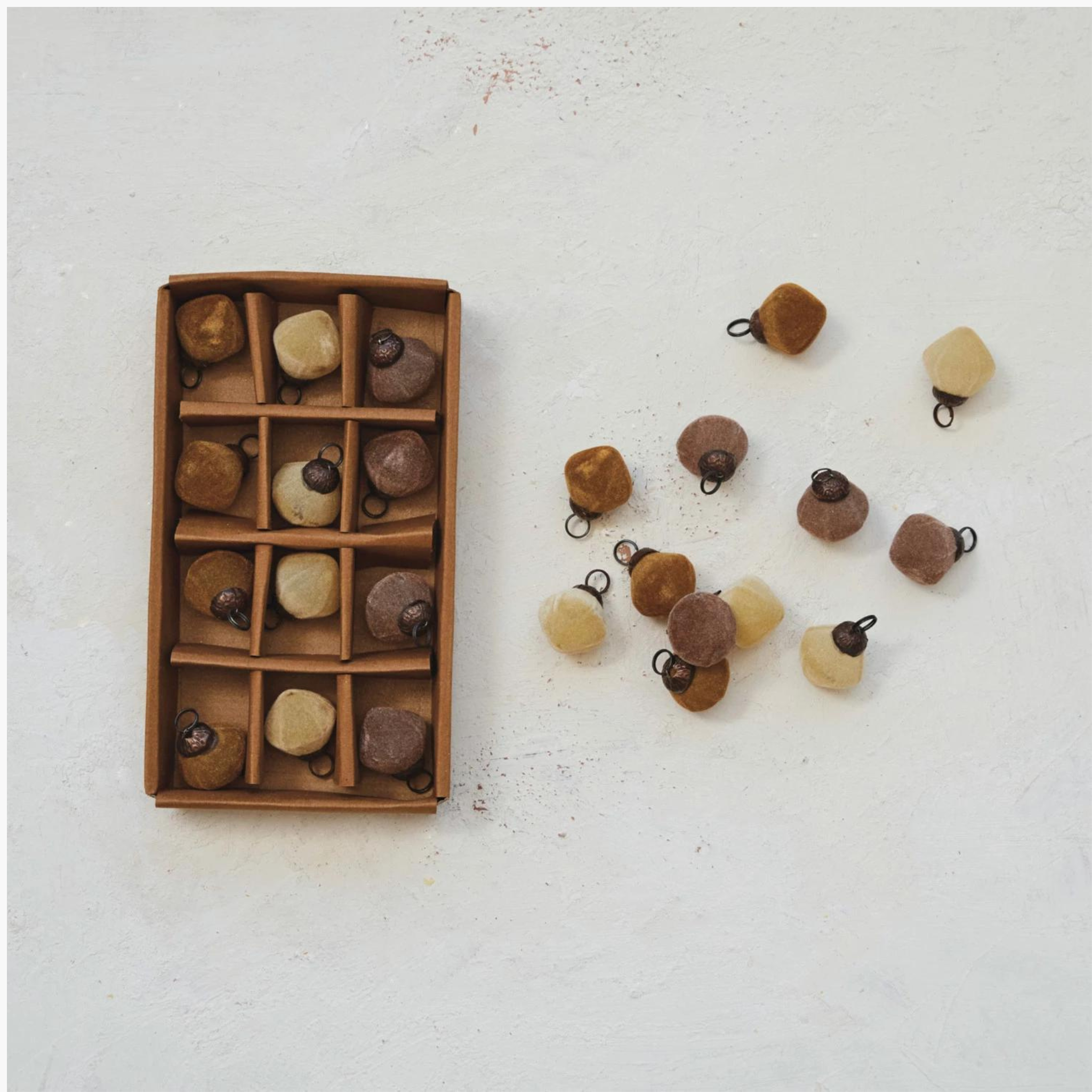 This set of 12 round glass ornaments adds a touch of understated elegance to any festive decorations. Each piece is flawlessly flocked, providing a velvety texture in a color palette of grey, cream, and brown. The colors blend perfectly with any theme, bringing a hint of sophistication. Whether they're hung on a tree, tucked into a garland, or displayed in a decorative bowl, these ornaments are sure to elevate the holiday spirit with their subtle beauty and timeless design. Standing at just 1 inch tall, they're the perfect size to become a beloved addition to your collection of holiday treasures. This is the perfect option for those who adore whimsical and charming holiday decor. A chic set of flocked glass ornaments, featuring a trio of serene grey, warm cream, and rich brown hues. An elegant collection that complements any decor style, from rustic to modern. Ideal for decorating a Christmas tree, creating a stylish display, or giving as a thoughtful gift to a dear friend