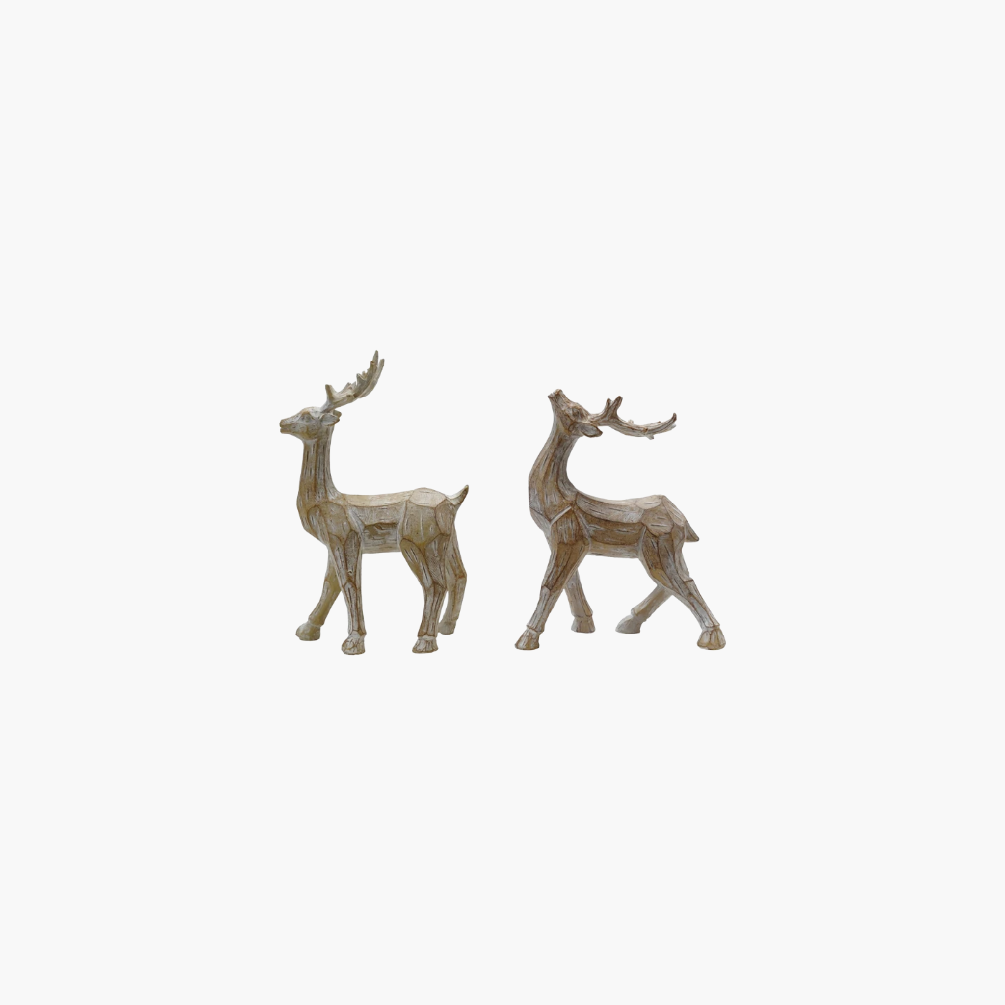 This charming reindeer figure brings festive cheer to any space with its rustic whitewashed appeal. Standing at 6-1/2" tall, it features a carved wood finish crafted from durable resin. Choose between two delightful poses—one gazing upward with wonder or another looking straight ahead with poise. Each style is sold individually, so you can mix and match to create your perfect holiday display.