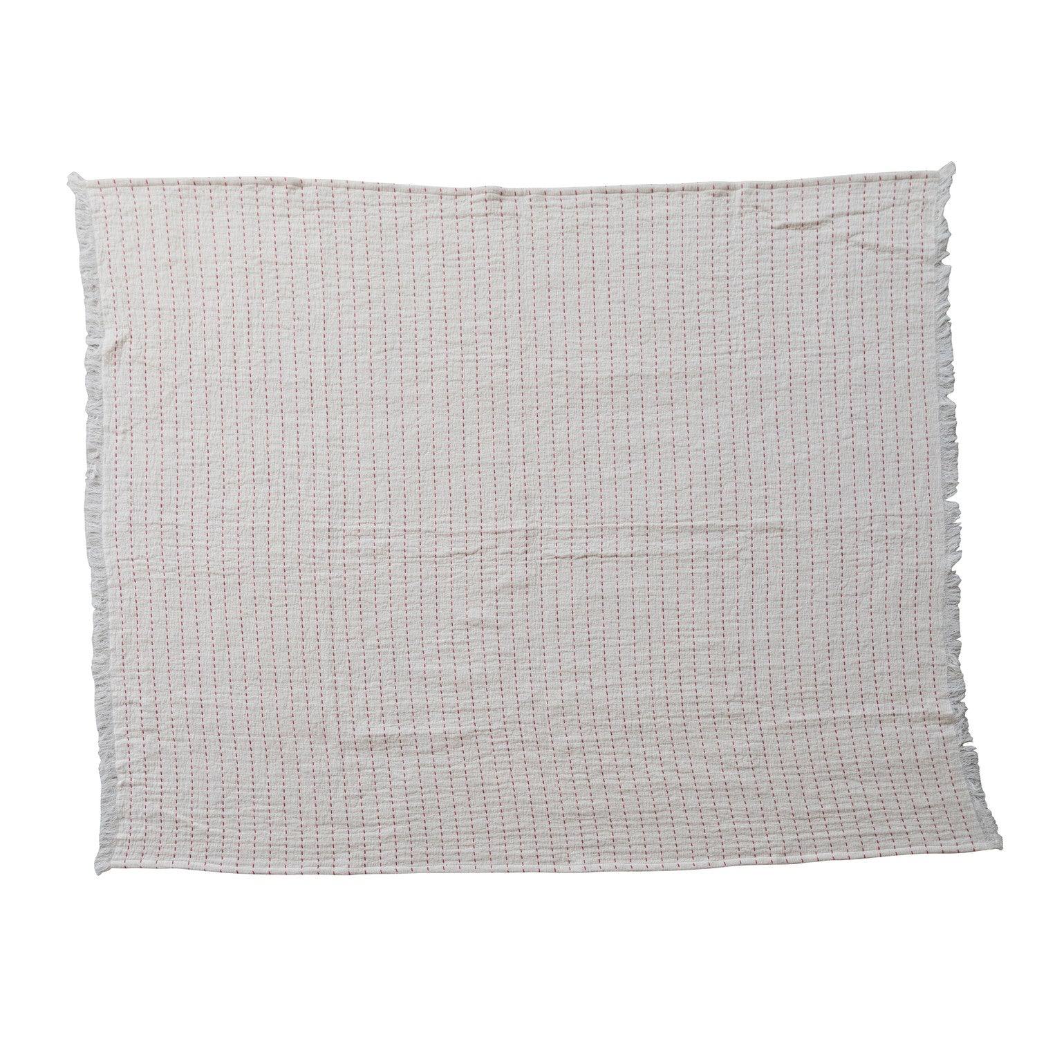 Wrap yourself in artisanal charm with this vibrant red throw, featuring traditional hand-embroidered kantha stitching that adds texture and visual interest. The playful eyelash fringe trim brings a flirty finishing touch, while the natural and red color palette complements any room's vibe. Perfect for cozying up on the couch or draping across your bed for that effortlessly curated look.