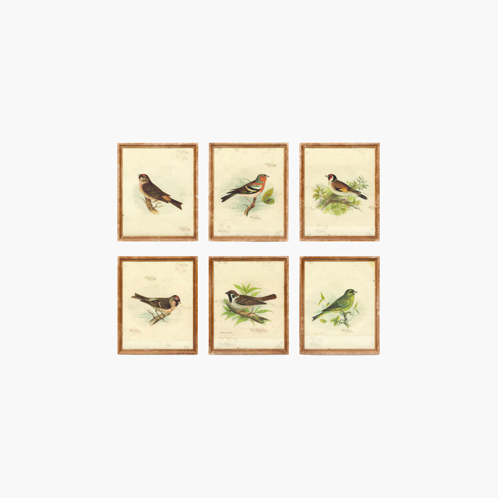 These vintage bird prints, framed in glass and distressed natural wood, offer a charming ode to nature. Only sold in a set of 6, each frame features a unique distressed natural wood frame and vintage print. Measuring L16" x H20" each, they make a lovely addition to any space.