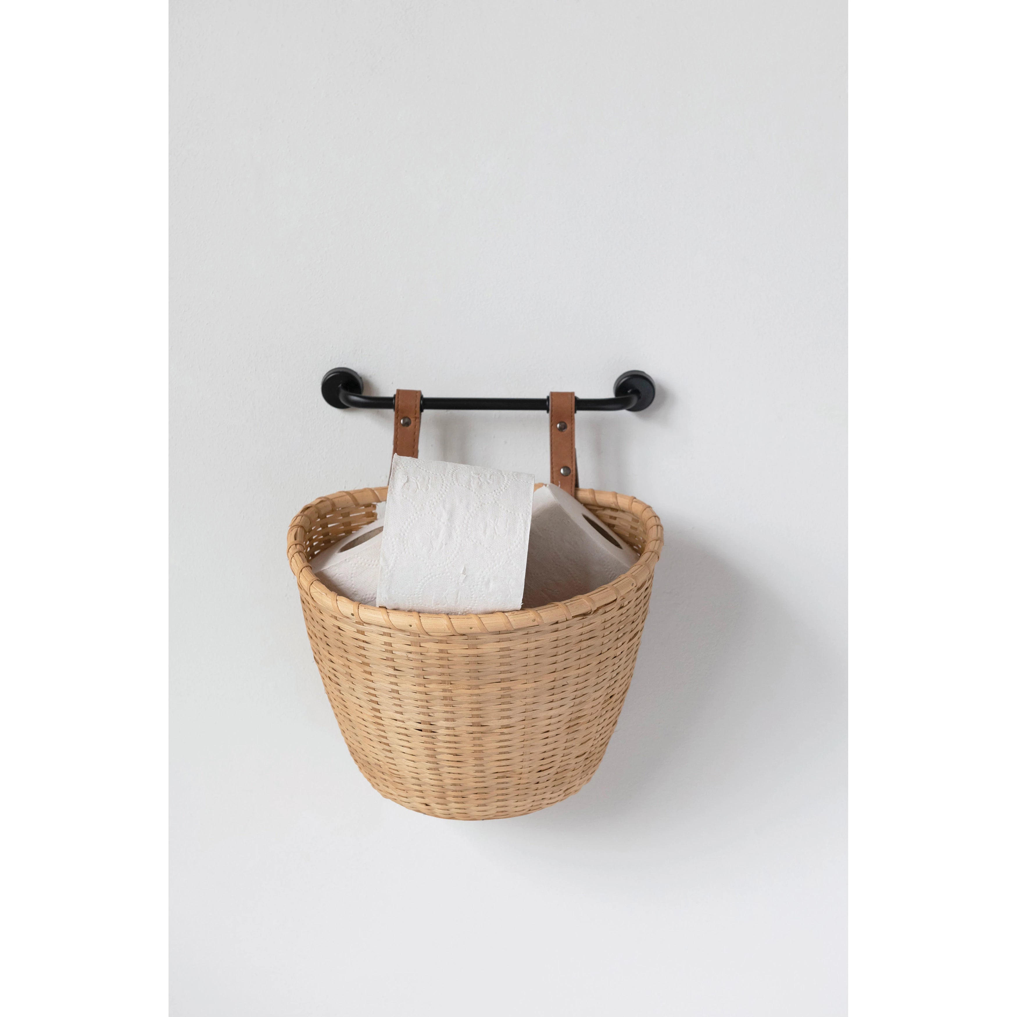 Crafted from durable bamboo and sporting a sleek metal bracket, this 12"W x 10"D x 12"H wall basket is both stylish and functional. The faux leather straps add a touch of rustic charm to its natural design. Hang it in your home for a unique and playful storage solution!