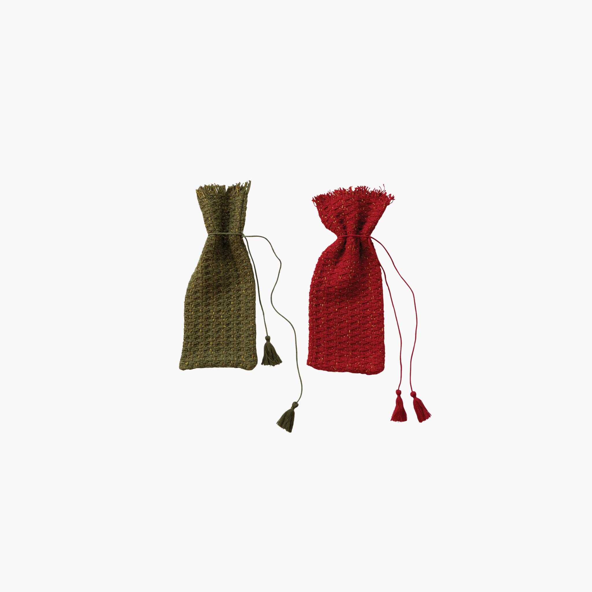 Add sparkle to your wine gifts with this playful set of two woven cotton bags featuring metallic gold thread and fun tassels in green and red. Sized to fit standard bottles, these cozy bags have a handy drawstring to keep your wine snug while making every toast feel festive. Perfect for carrying, gifting, or decorating—let your wine shine with a touch of holiday cheer!