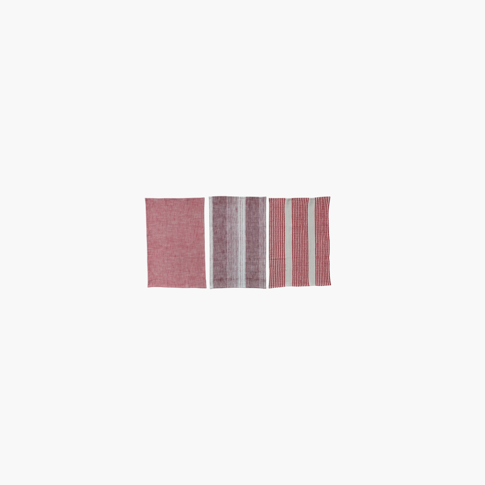 Three charming woven tea towels in festive red and natural tones, each measuring 28" x 18". This delightful set arrives beautifully bundled with twine and a cheerful jingle bell—perfect for gifting or adding a touch of holiday cheer to your kitchen. The patterned weave combines practicality with seasonal style.